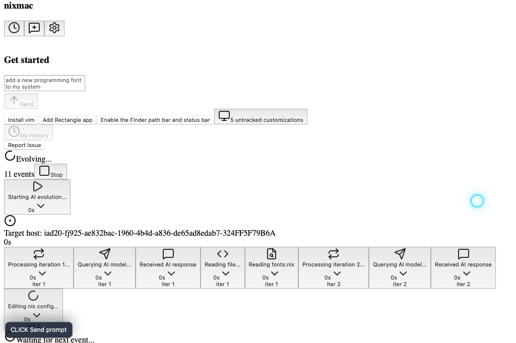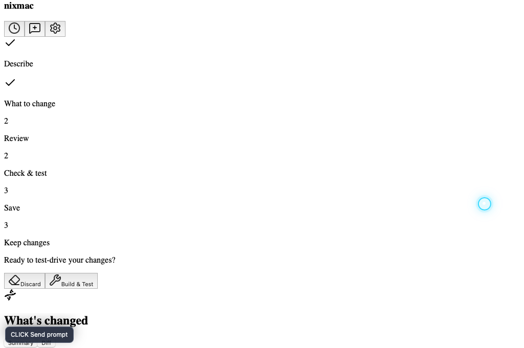 b13f39985b8718bb8c881755235f51bbb8d63a66bun run test:wdio:basic-promptsSubmits a mocked AI prompt and verifies nixmac reaches review with a generated Nix diff.